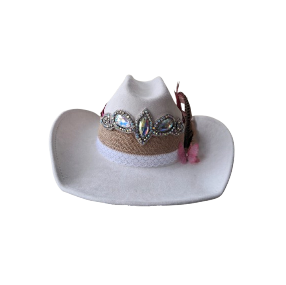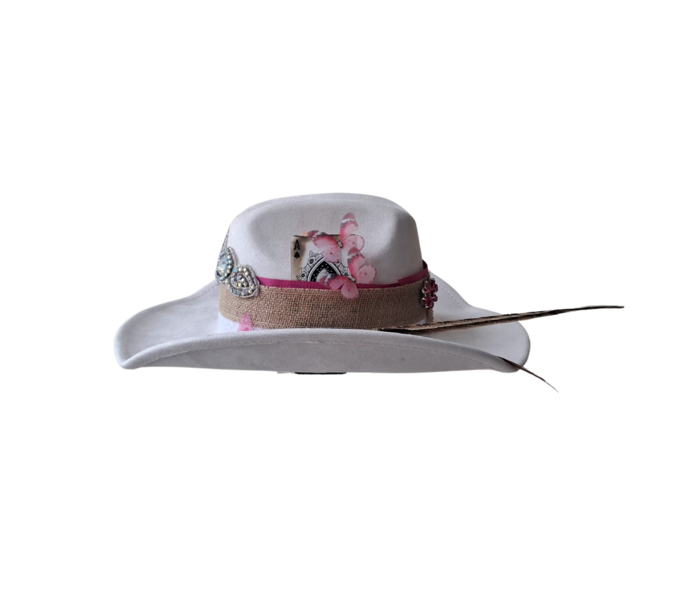 This ivory-toned hat blends rustic charm with playful elegance. Featuring soft pink butterflies, a sparkling ace of spades card, and a duo of long feathers, Ace of Grace is a whimsical nod to fantasy and flair — perfect for those who live life with a touch of magic and mischief.