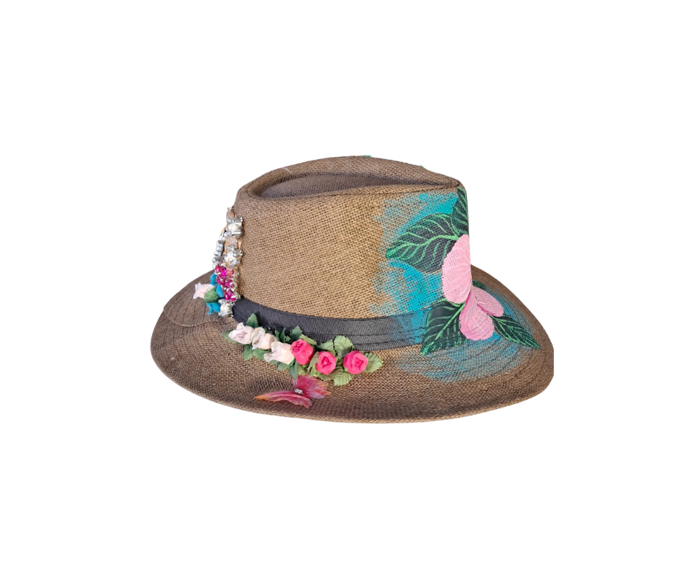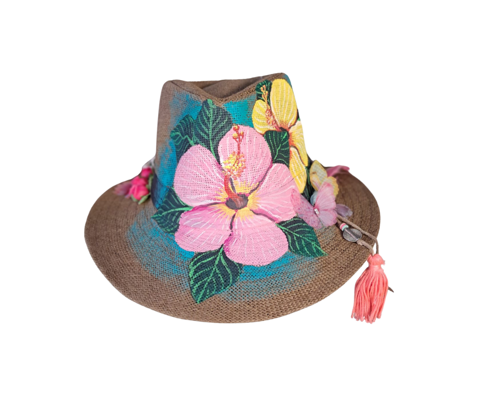 Hand-painted with vibrant hibiscus flowers, Aloha Bloom captures the essence of tropical paradise. Its natural woven base, coral tassels, and lush floral brushstrokes make it a radiant ode to island beauty — perfect for sunny escapes and joyful souls.