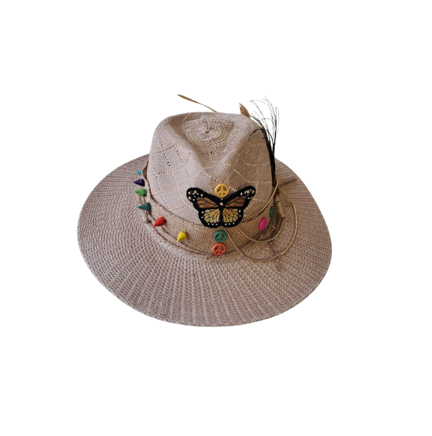Joyful and free-spirited, Boho Vibes blends natural tones with colorful peace signs, playful charms, and a bold butterfly centerpiece. Finished with fine chains and feathers, this hat radiates carefree energy — made for dreamers, wanderers, and sunshine souls.