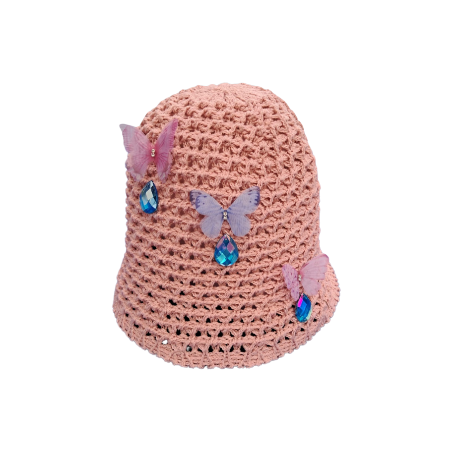 Delicately hand-knitted in blush pink, Crystal Flutter is adorned with soft butterflies and sparkling blue gems. Light, whimsical, and full of charm, it’s the perfect piece for those who love elegance with a magical twist.