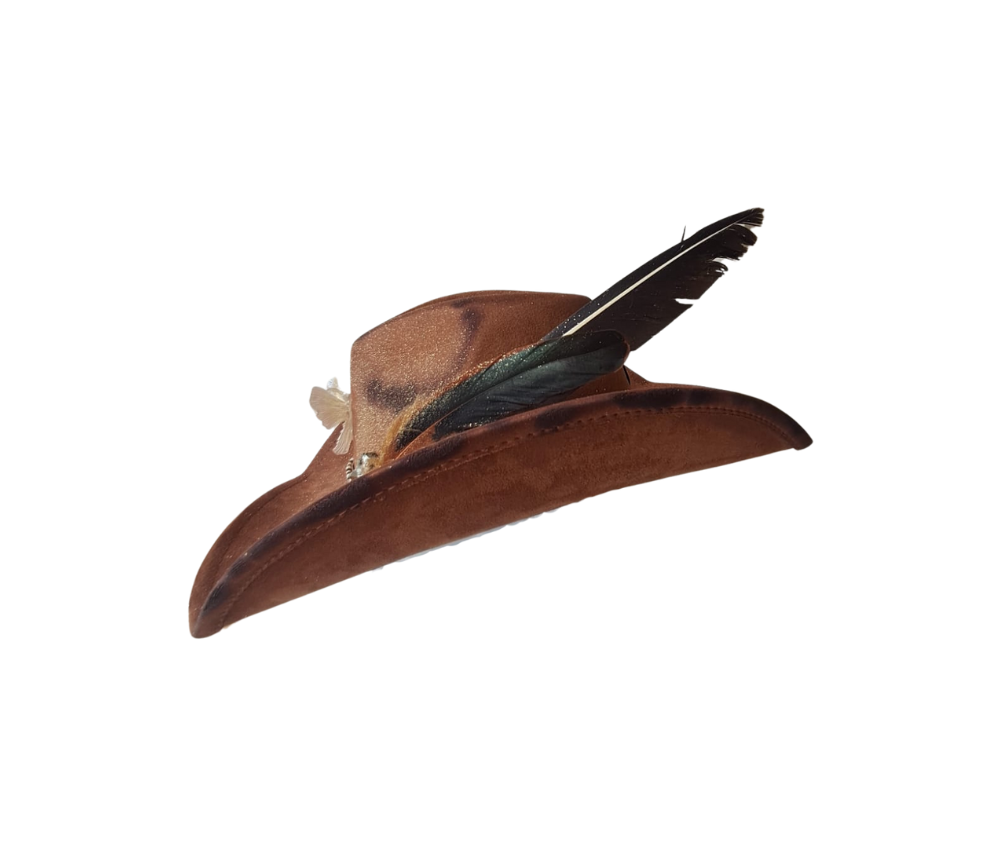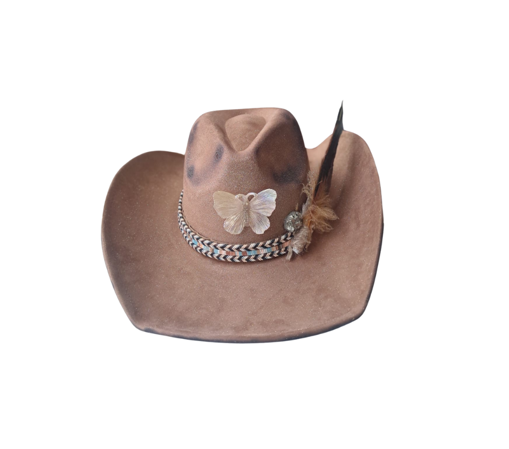 A tribute to western spirit with a poetic twist, Desert Bloom features a soft brown cowboy silhouette adorned with a delicate neutral butterfly, rustic braiding, and textured feathers. Handcrafted with soul, it’s the perfect harmony of strength and subtle beauty.