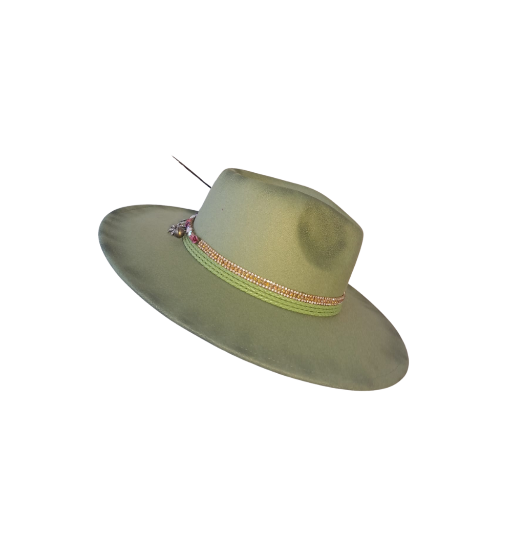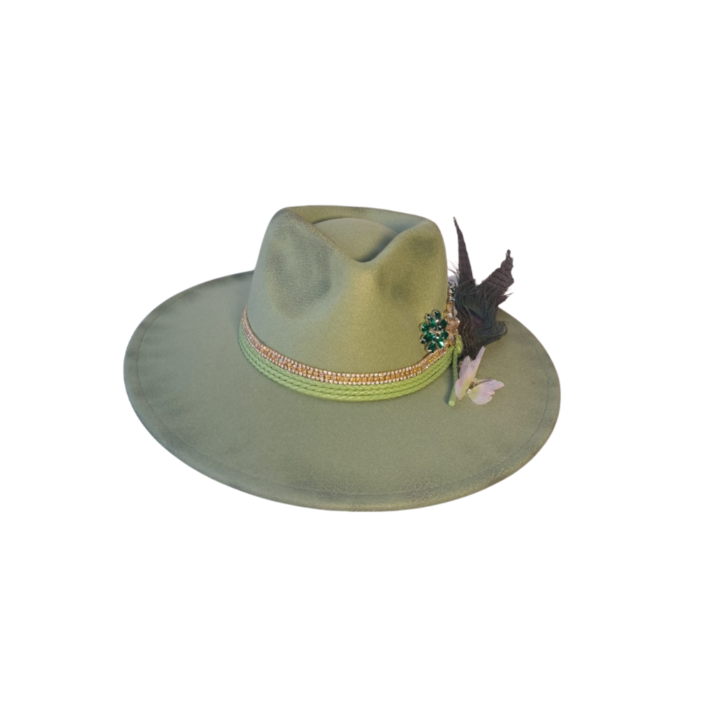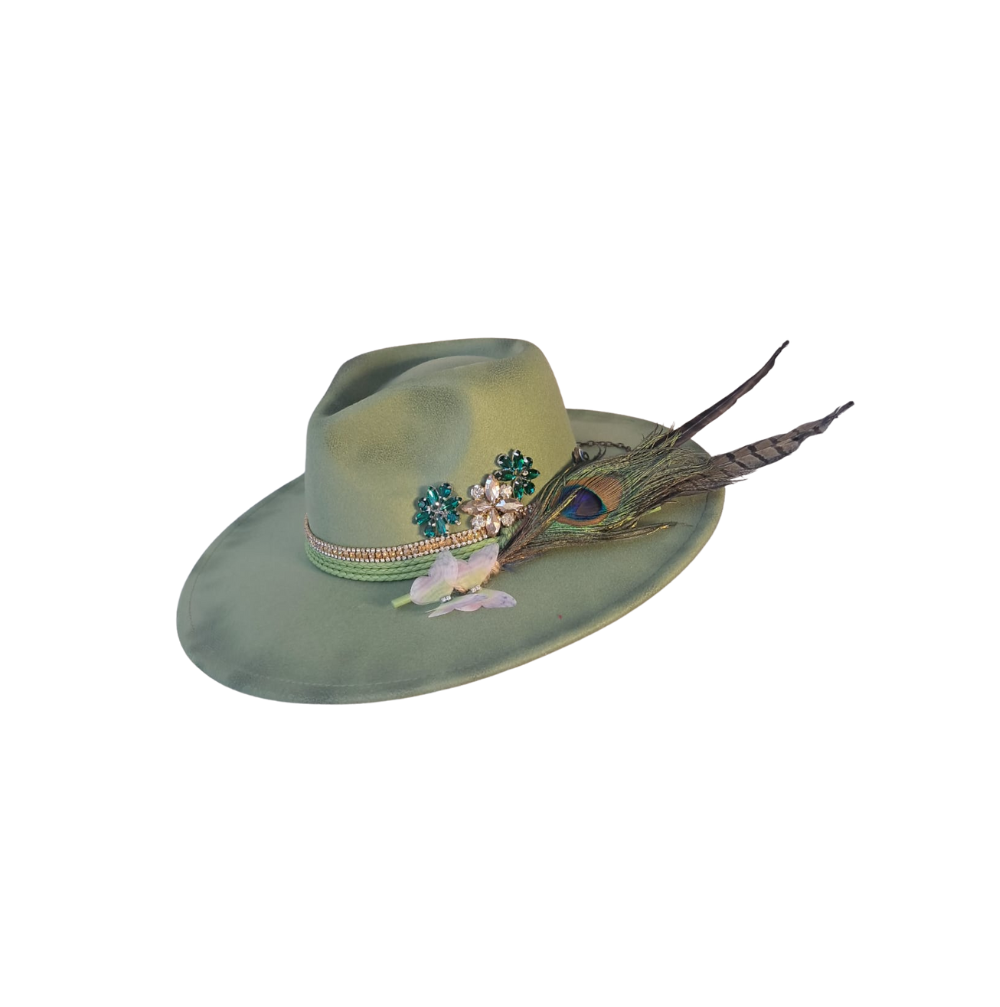 Soft and serene, Emerald Whisper is a sage green creation that radiates quiet elegance. Accented with a sparkling green gem, delicate flowers, and deep feathers, it’s a refined piece that brings a touch of nature’s calm to any bold look. Effortlessly graceful, endlessly unique.