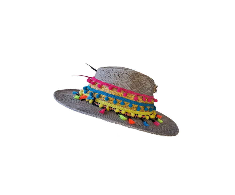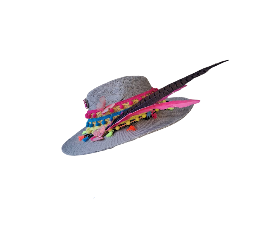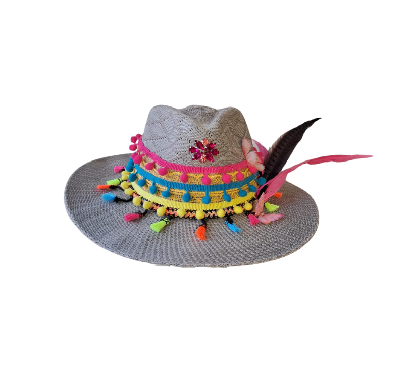 Bursting with color and personality, Fiesta Spirit is a celebration in hat form. Bright tassels, playful feathers, and sparkling accents come together on a neutral woven base, making it the perfect companion for festivals, sunny escapes, or simply stealing the spotlight.