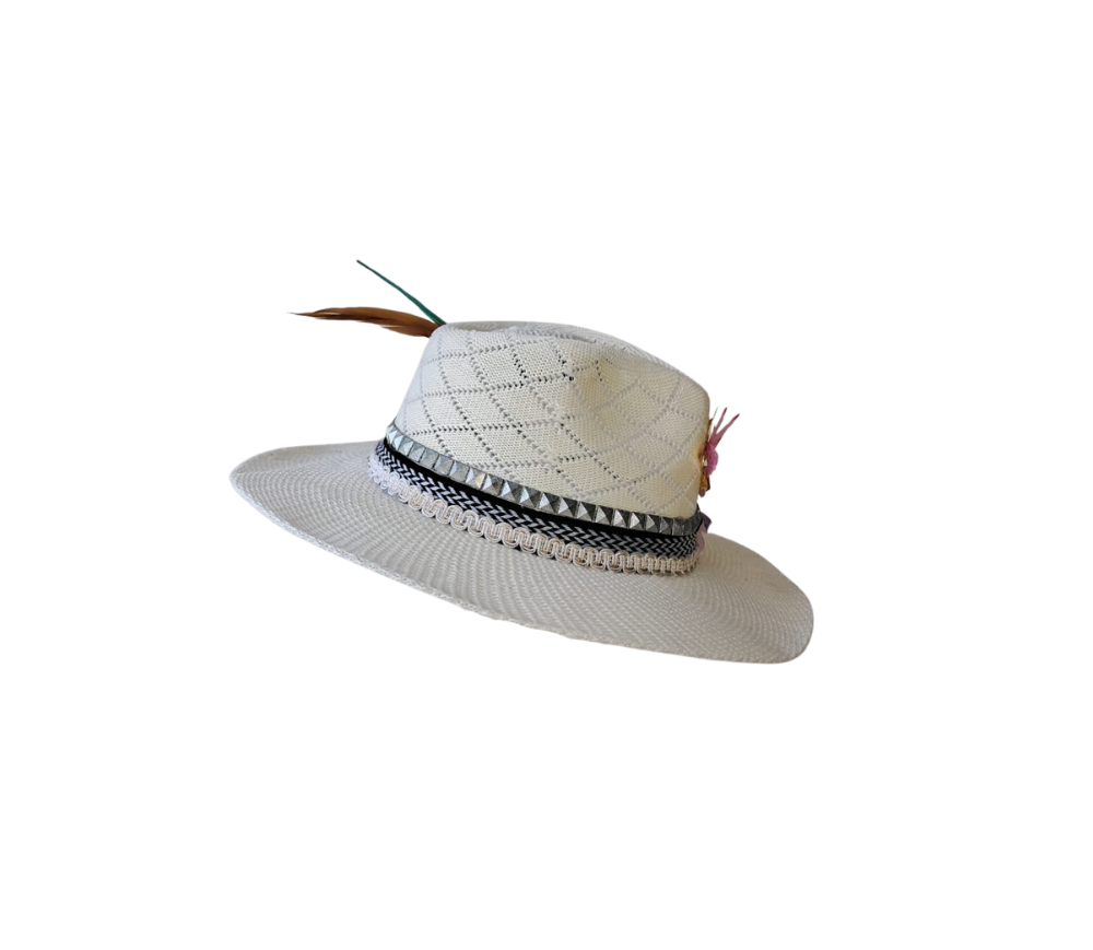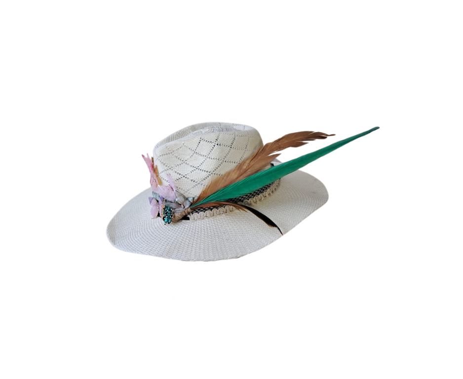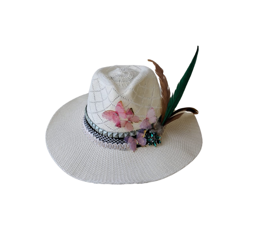 Fresh and luminous, Garden Glimmer combines a crisp white weave with soft pink butterflies, shimmering gems, and a striking green feather. Elegant and dreamy, it’s a delicate ode to nature’s beauty — perfect for sunny days and graceful moments.