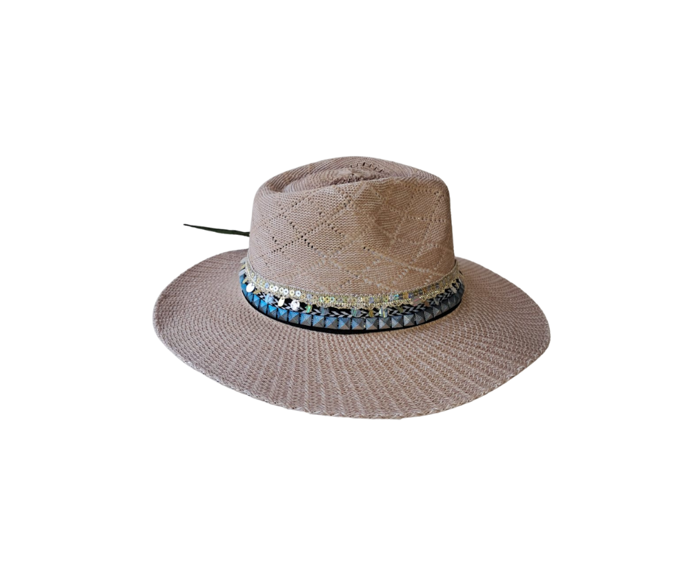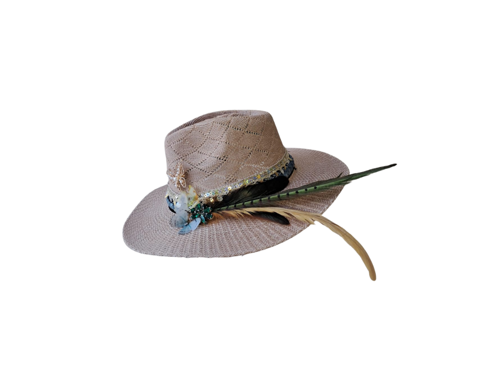 Delicate and radiant, Golden Mirage pairs natural woven tones with shimmering mirror tiles, a pearl-studded star, and soft butterfly details. Finished with earthy feathers and subtle sparkle, this hat captures the magic of sunlit moments and golden-hour elegance.