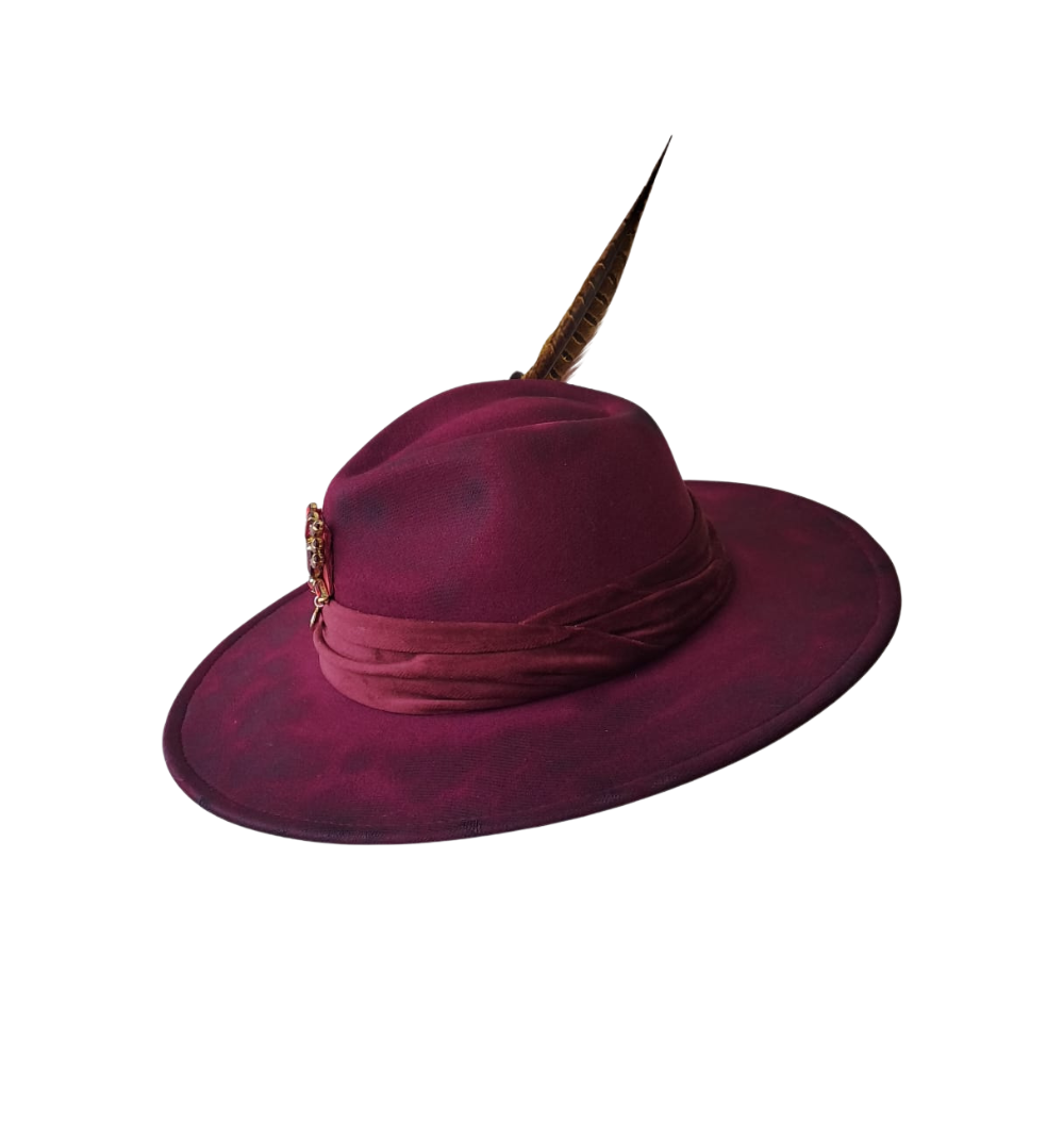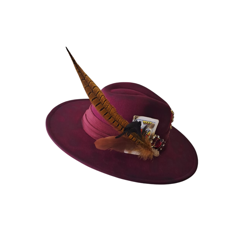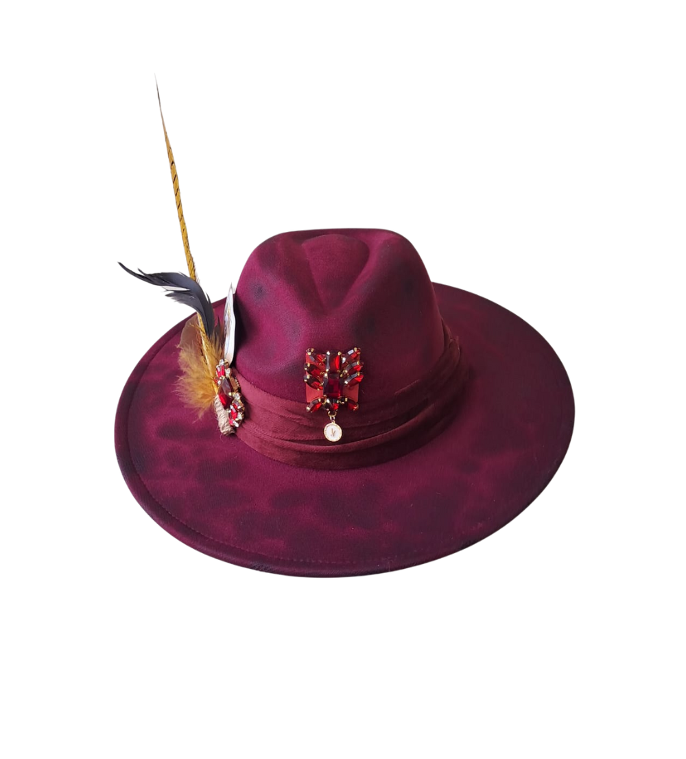 Regal and radiant, this burgundy masterpiece is adorned with crimson gemstones, a golden charm, and a striking feather trio — blending elegance with a bold statement. Handcrafted to captivate, Imperial Ruby is the crown jewel of any daring wardrobe.