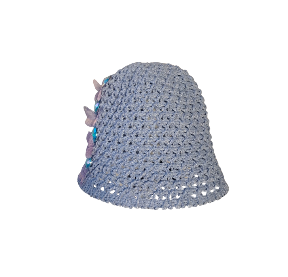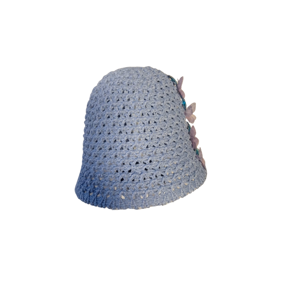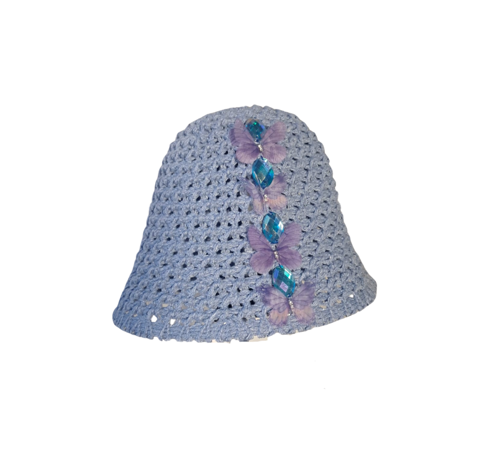 Entirely hand-knitted in a soft lavender hue, Lilac Breeze is adorned with delicate purple butterflies and shimmering blue crystals. Light, airy, and lovingly crafted, it’s a gentle blend of charm and sparkle — a summer essential with a touch of magic.