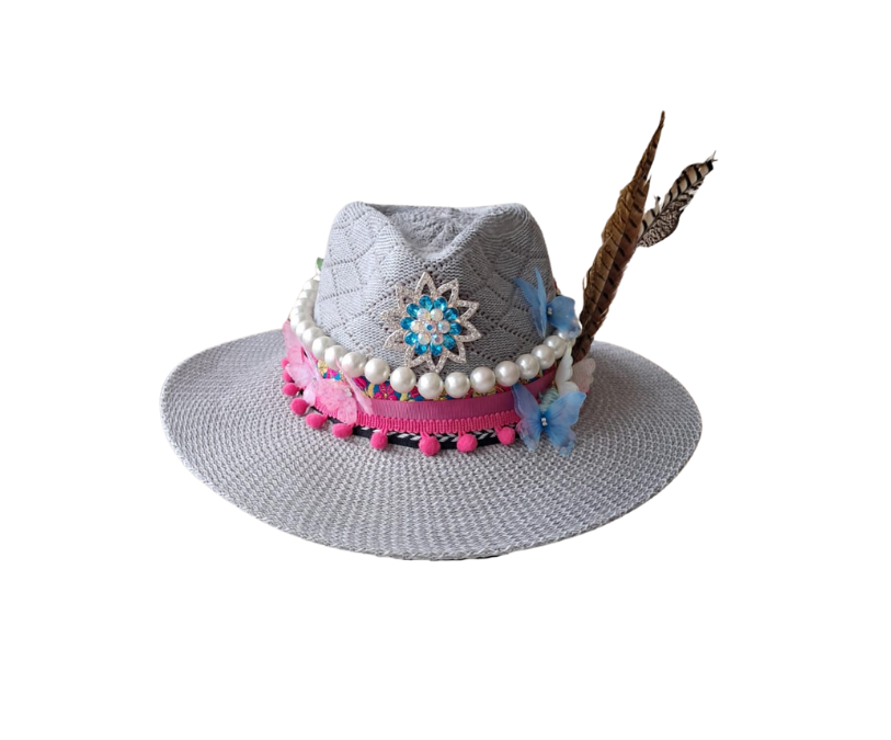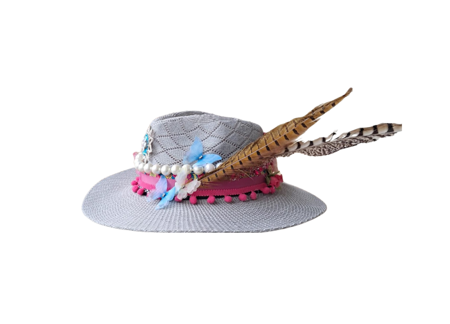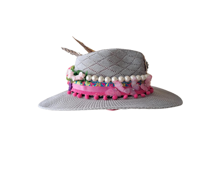 Charming and full of life, Pearl Garden mixes pastel butterflies, pearl strands, and a bright floral motif on a soft grey base. Accented with pink pompoms and elegant feathers, this hat is a joyful celebration of color, femininity, and playful sophistication.
