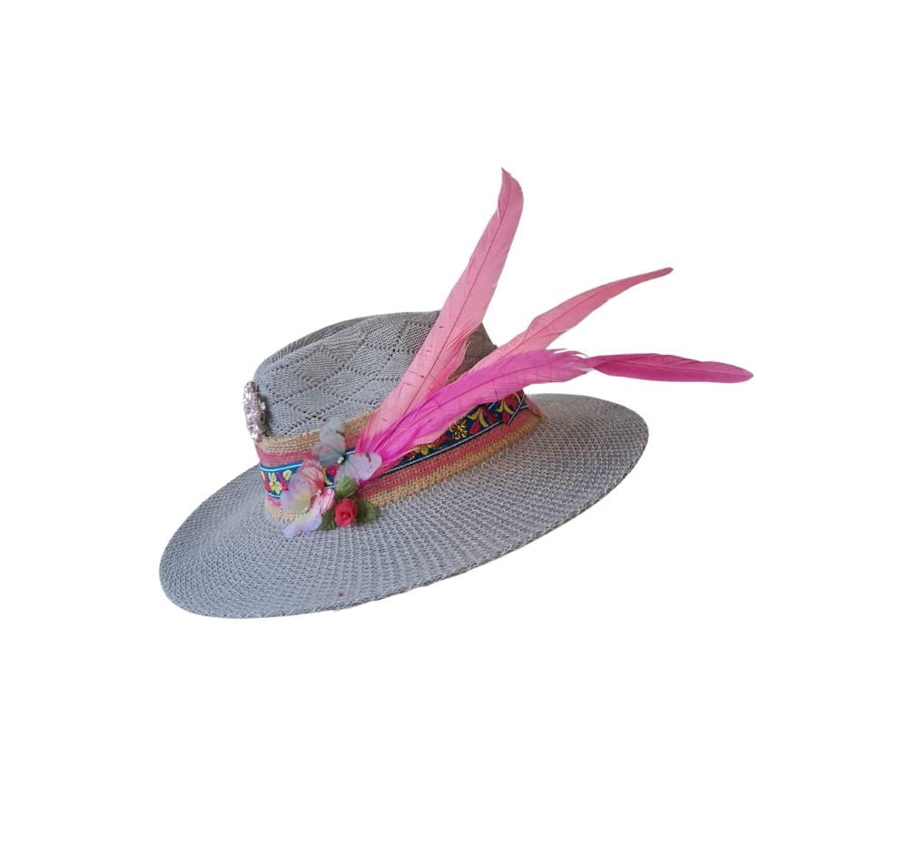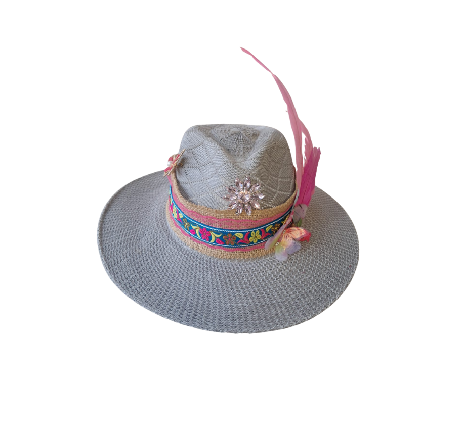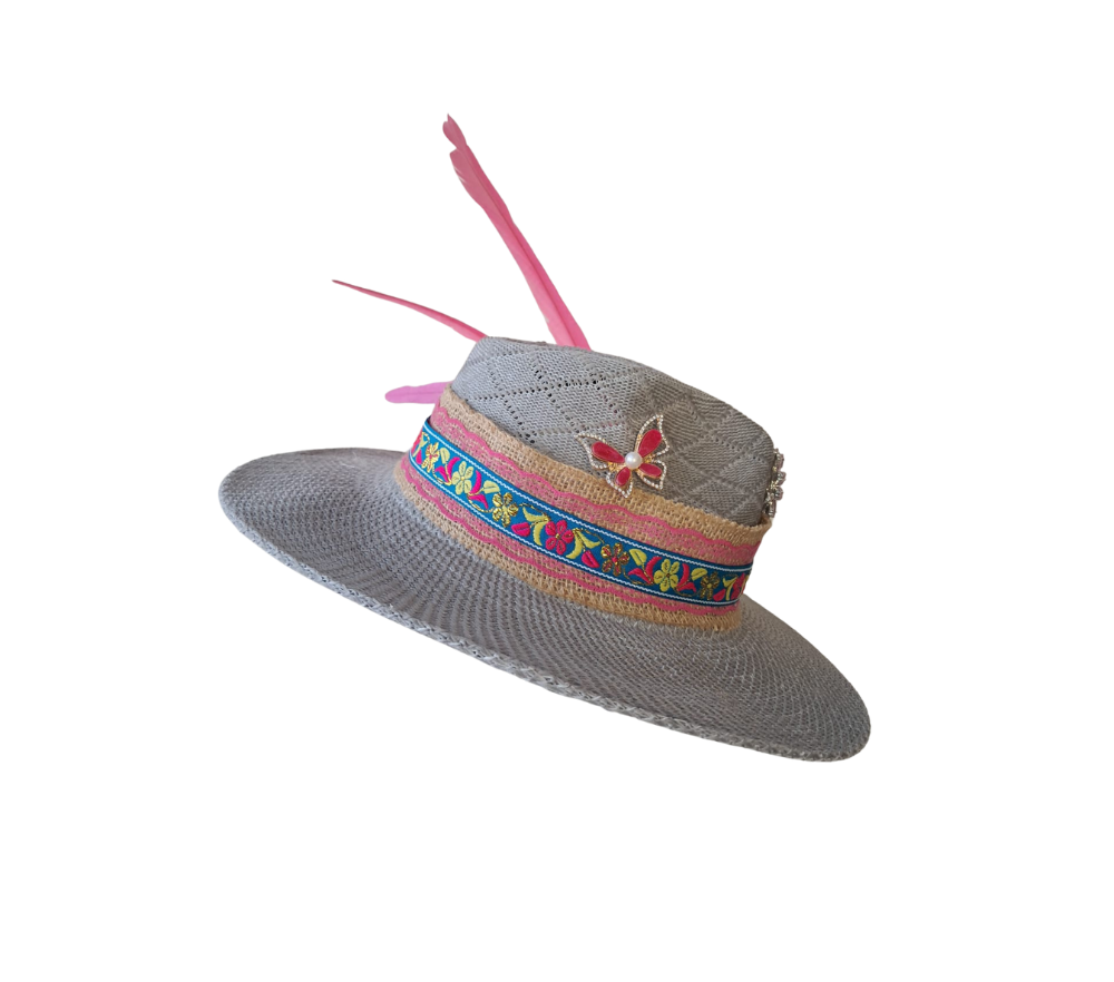 Vibrant and feminine, Pink Blossom charms with its embroidered floral band, radiant crystal brooch, and soft butterflies. A bold pink feather adds a playful flair, making this hat a joyful blend of tradition, color, and confident style.