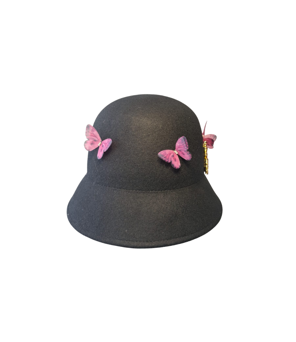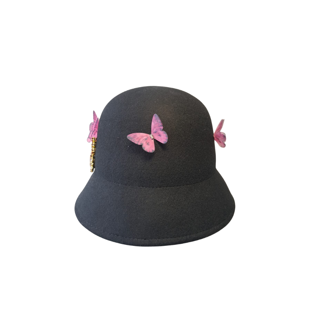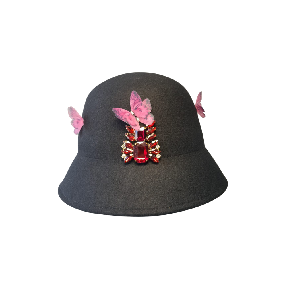 A graceful fusion of romance and refinement, Velvet Bloom features a rich black base adorned with vivid pink butterflies and a dazzling ruby-red gem centerpiece. Delicate yet bold, this hat brings a poetic touch to any outfit — where softness meets sparkle.