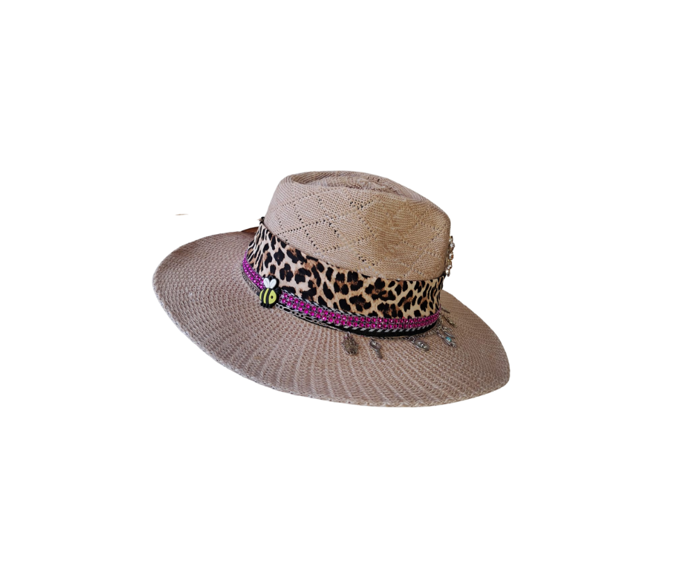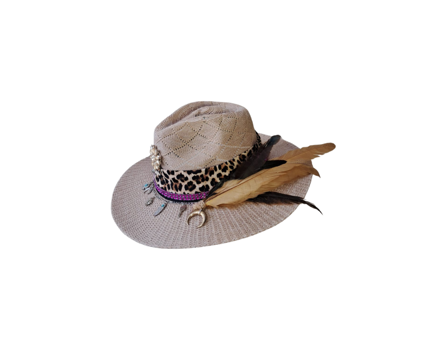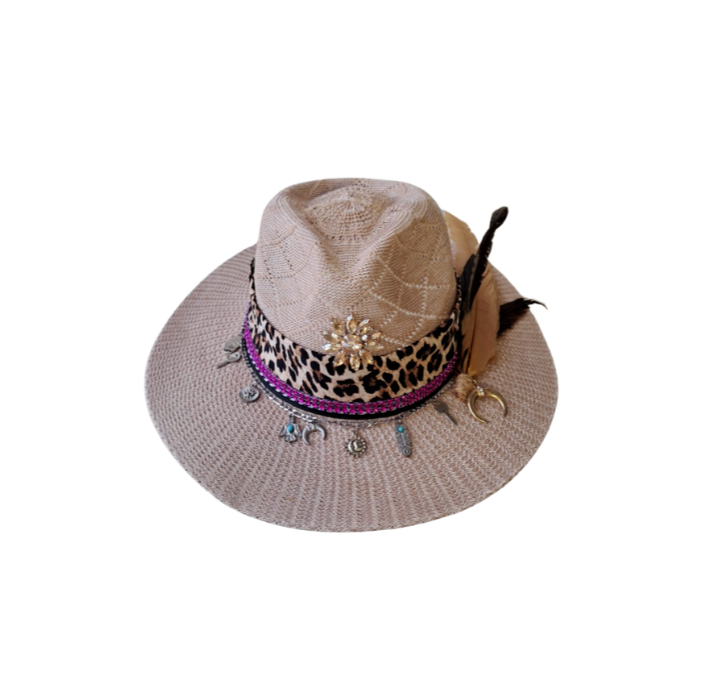 Fierce and mystical, Wild Moon combines leopard print, sparkling gems, and celestial charms for a look that’s both bold and enchanting. Accented with feathers and rich textures, this hat channels untamed elegance — perfect for nights under the stars or wild-hearted days.