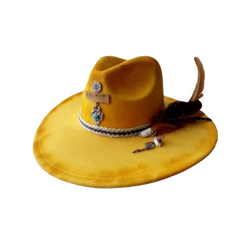Inspired by the spirit of the Wild West, this vibrant yellow hat captures adventure and elegance. Handcrafted with exquisite detail, it features playful feathers and rustic accents, making it a standout piece for those who dare to be bold and unforgettable.